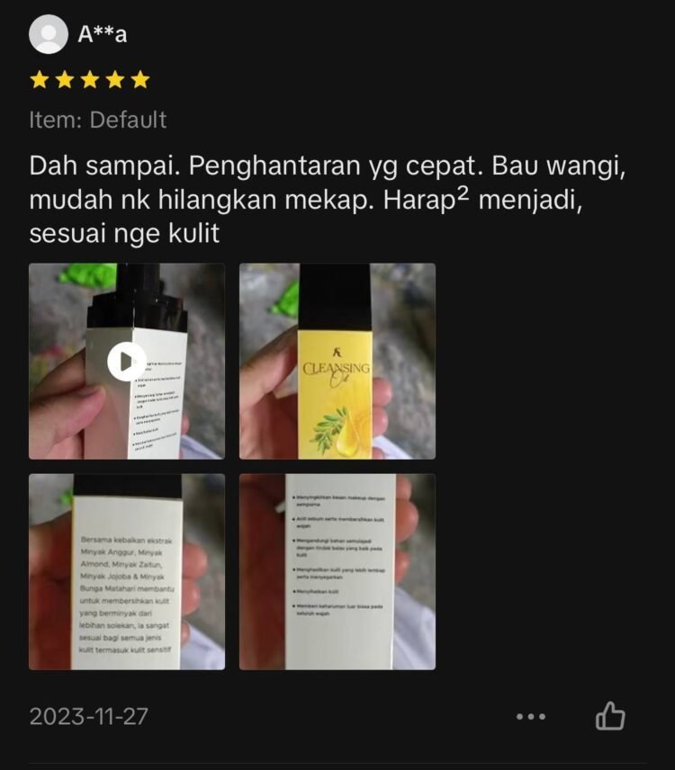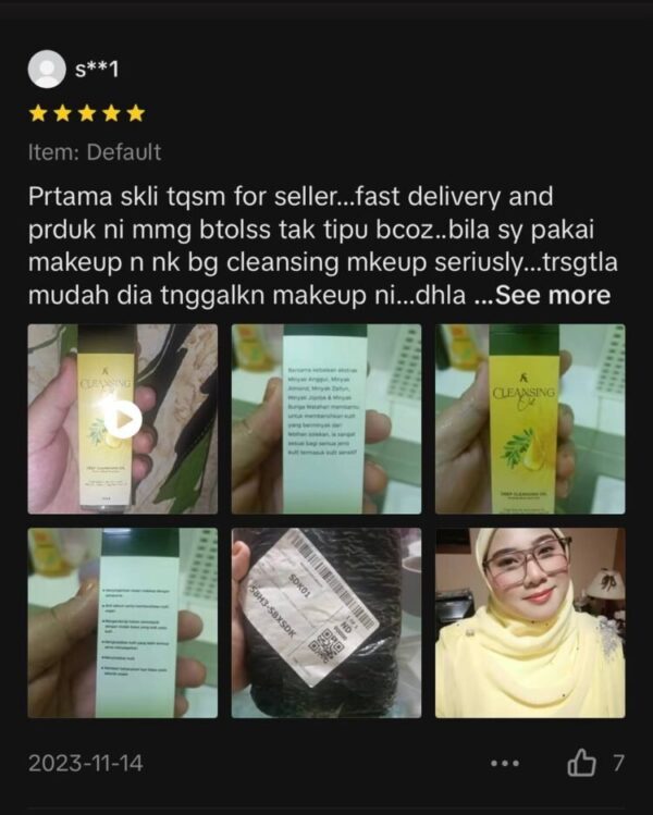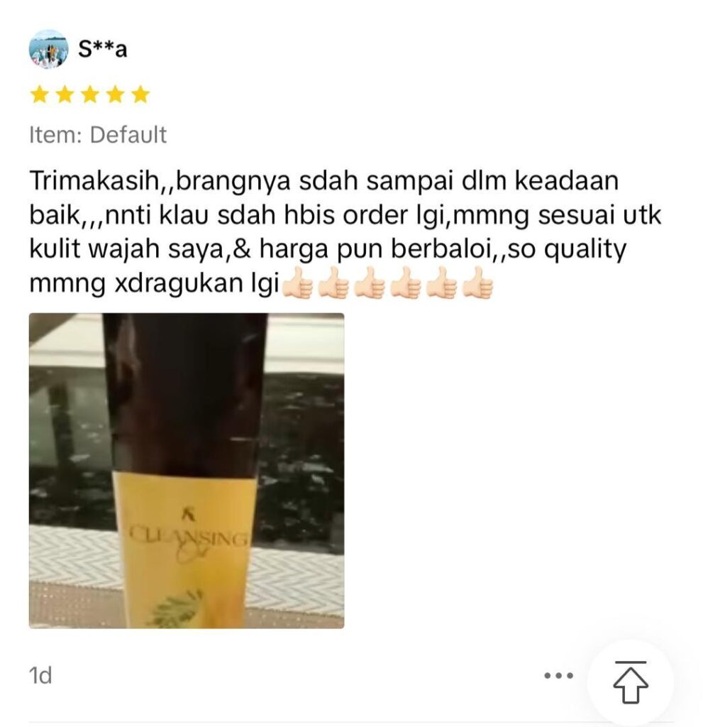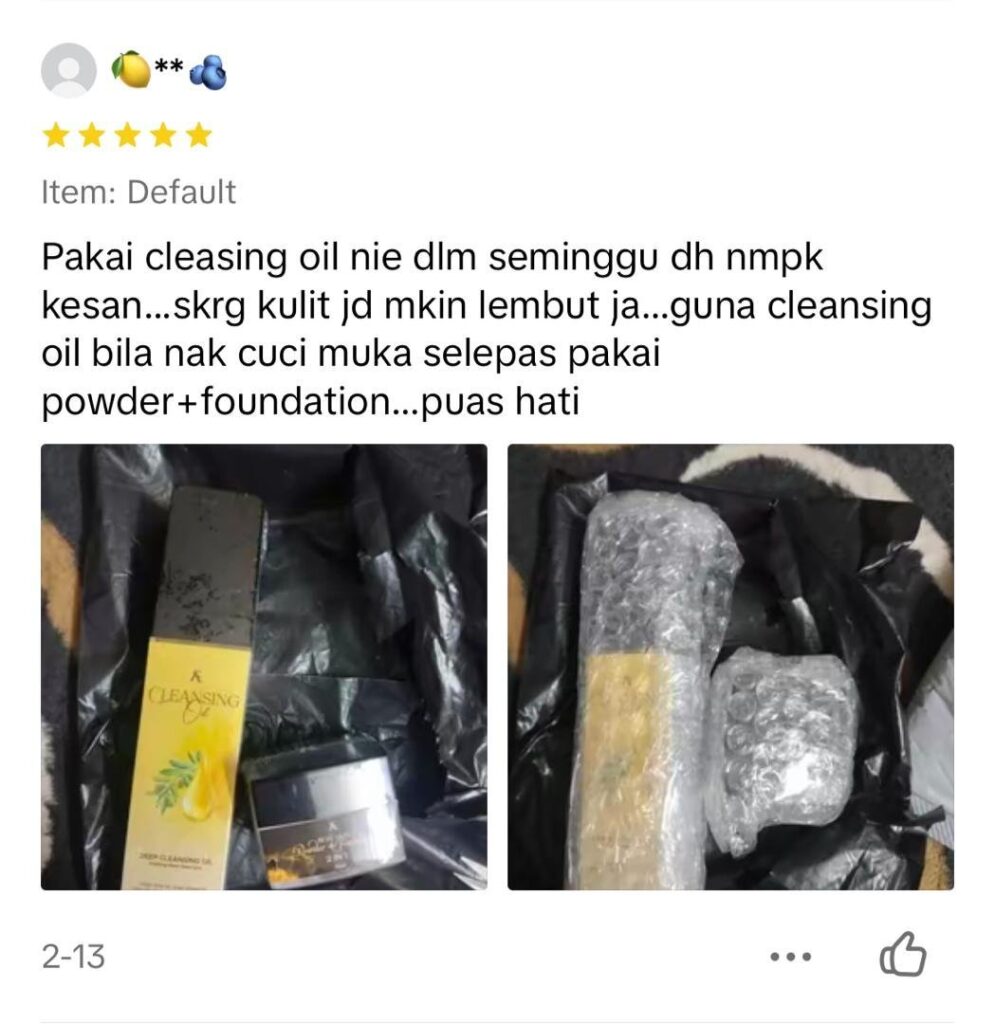 Ramai pengguna yang dah berpuas hati setelah melihat hasil kulit muka yang bersih, anjal dan berseri selepas menggunakan Cleansing Oil dengan hanya 1 pcs sahaja ! Jangan tunggu lagi, tempah sekarang sebelum stok promosi habis